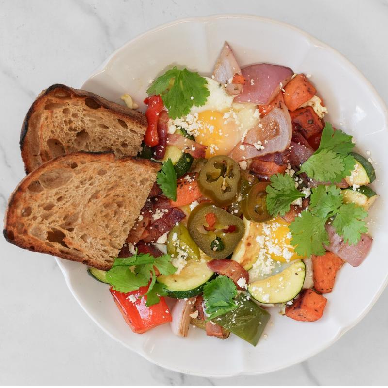 Sweet potatoes, bell peppers, zucchini, bacon bits, onions cooked with 3 sunny side eggs, topped with crumbled feta, cilantro, pickled jalapeno, with side of toast